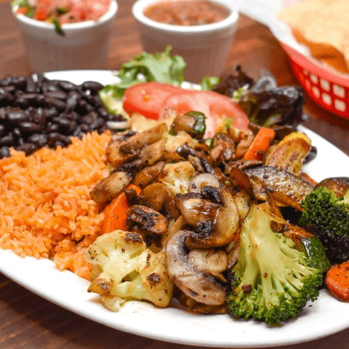 Mushrooms, cheese, guacamole, sour cream, lettuce, and salsa in a flour tortilla.